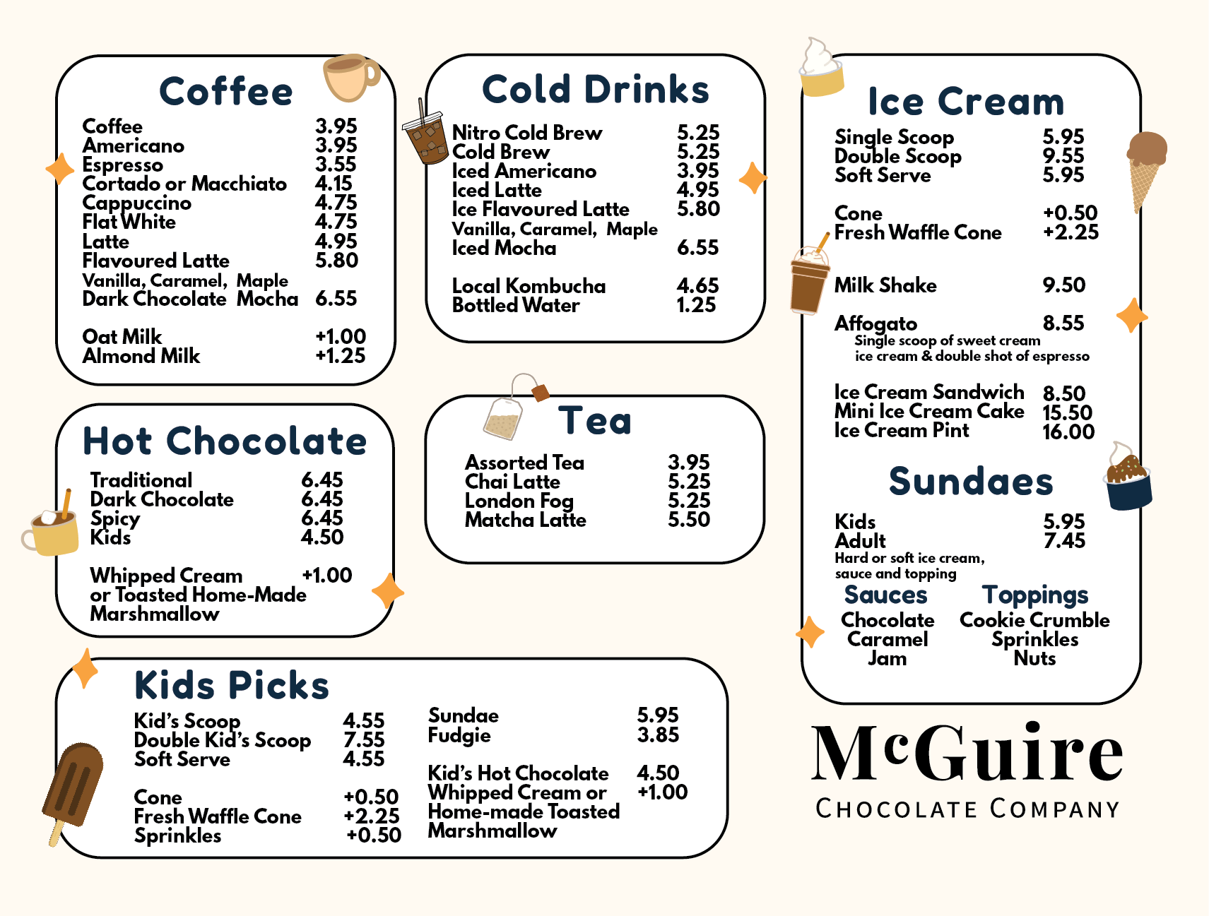 We make all of our ice cream in house. The coffee we serve is sourced from from Epoch Chemistry - a delicious coffee roaster in Moncton, NB.