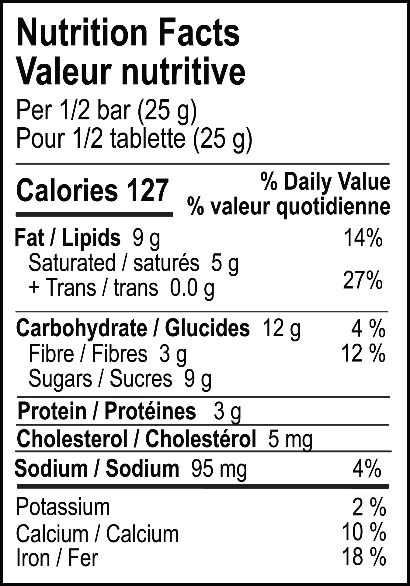 Ingrédients: Fèves de cacao, Sucre de canne*, Beurre de cacao*, Lait entier en poudre, Sel de mer. Contenir: Lait. Peut contenir: Des arachides, Noix.