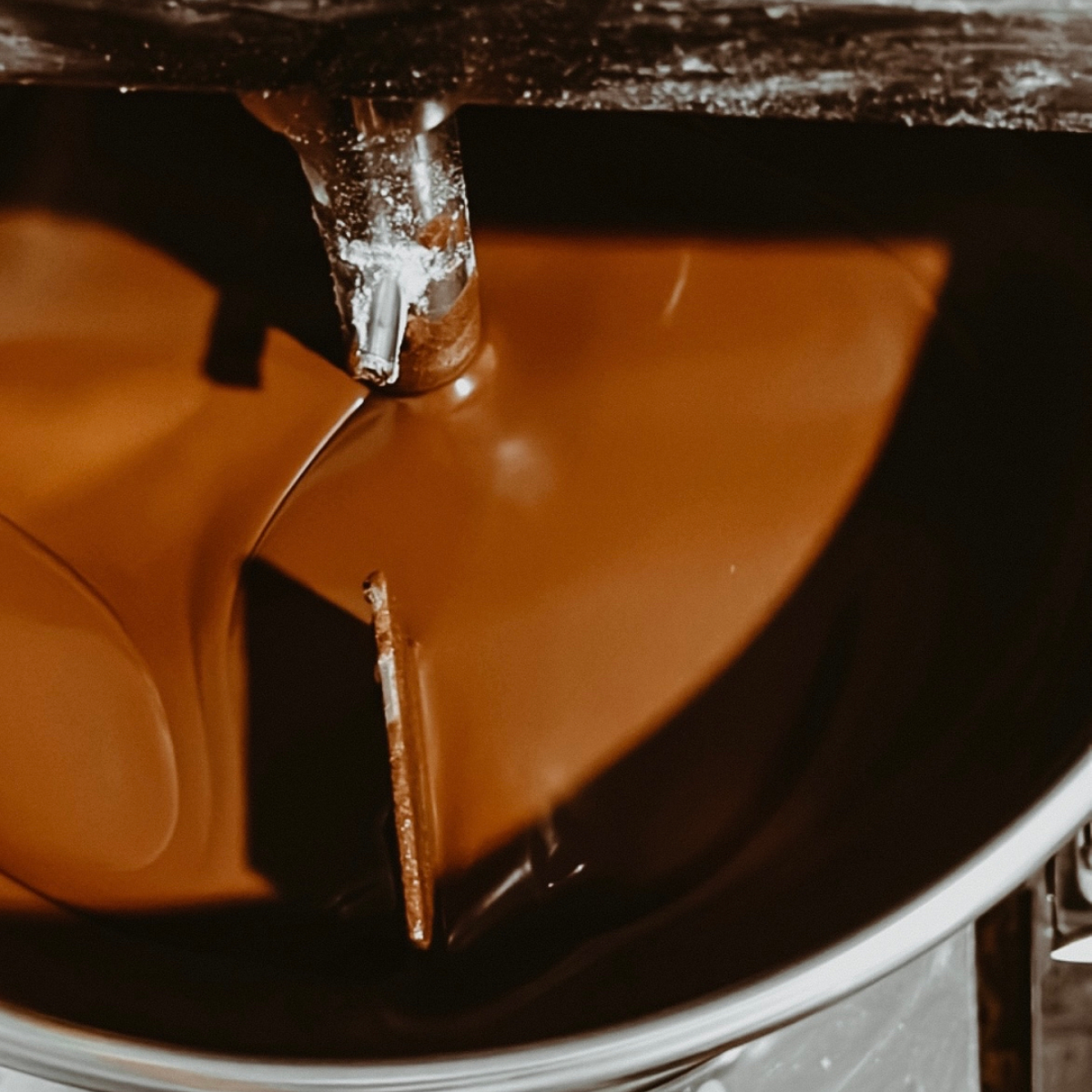Melangers stones are made of heavy granite and roll over cacao until the fat naturally liquifies and eventually smooths out. This grinding process takes a week to complete and is where all of the ingredients of chocolate come together.
